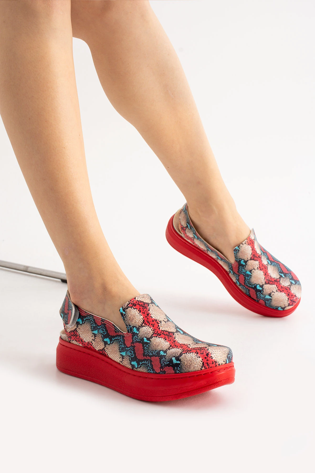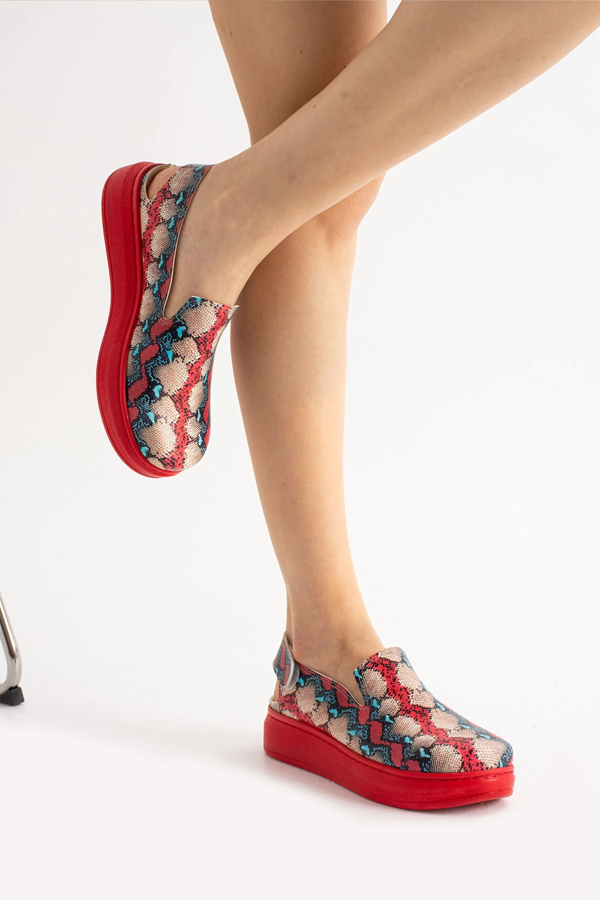 1039 Renkli Yılan Derisi Cırtlı Kırmızı Tabanlı Platform Sandalet