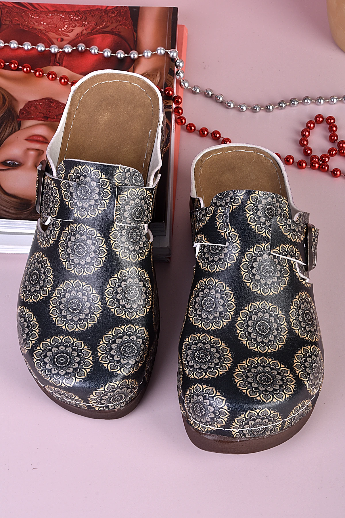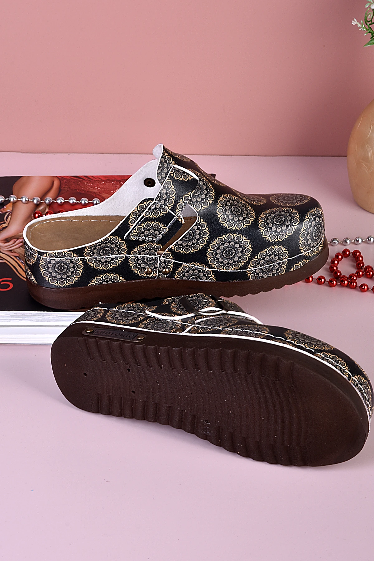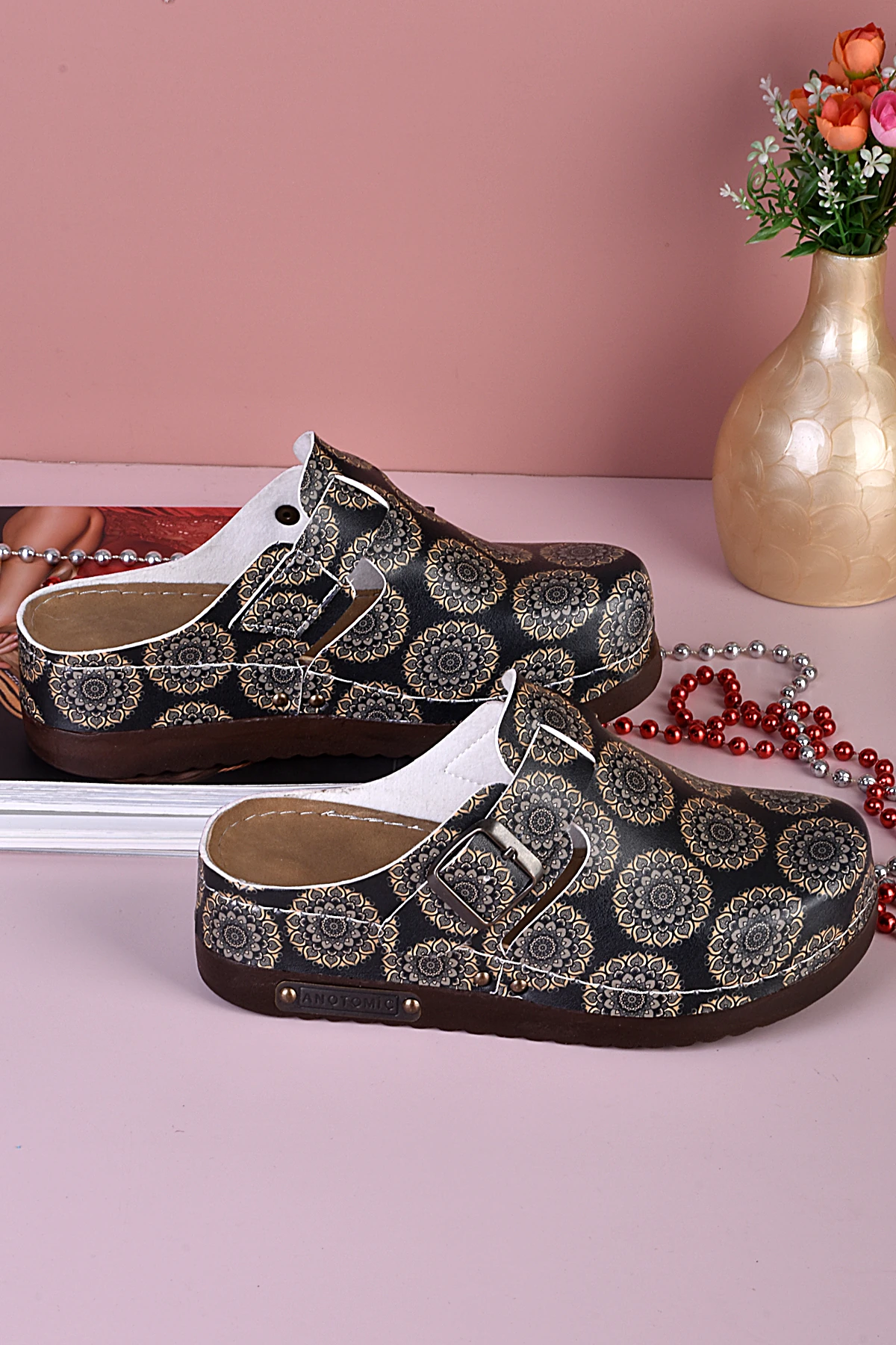 8005 Çiçek Desenli Siyah Tabanlı Anatomik Terlik